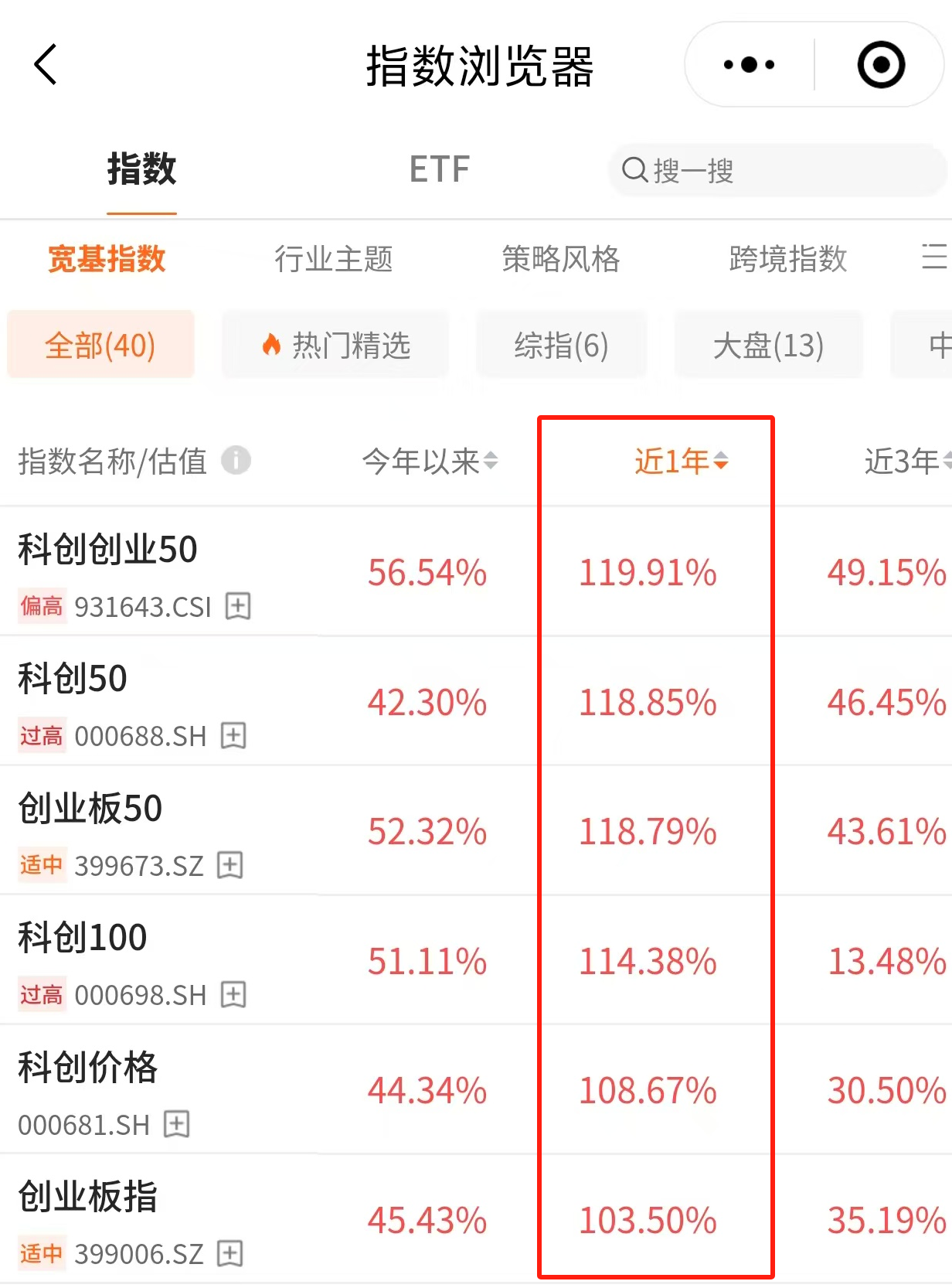 宽基指数惊喜也不小,5只实现翻倍:科创50大涨114%,创业板50大涨107%,创业板指也接近翻倍!$华夏科创创业50ETF联接A(OTCFUND|013310)$