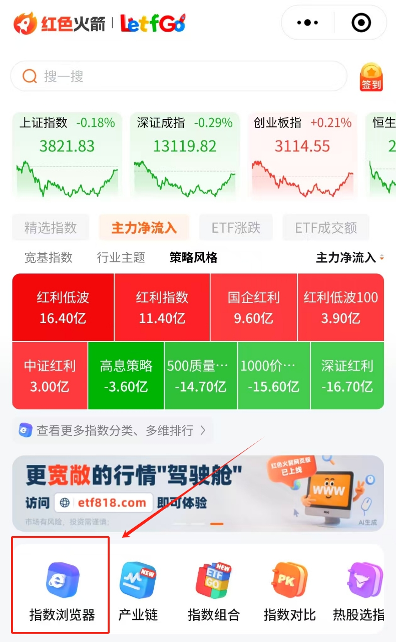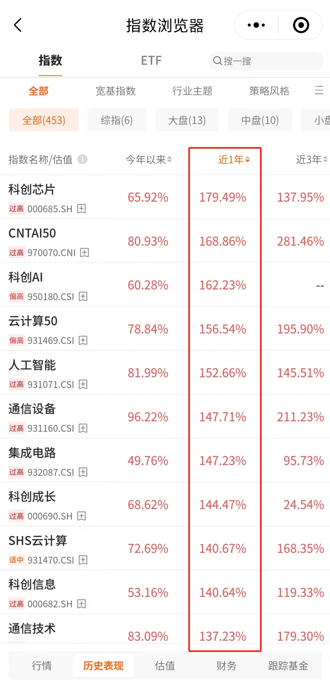 打开“红色火箭”小程序,点进“指数浏览器”,再按“近1年”(回报)排序,就能看到近一年涨幅最猛的指数。
