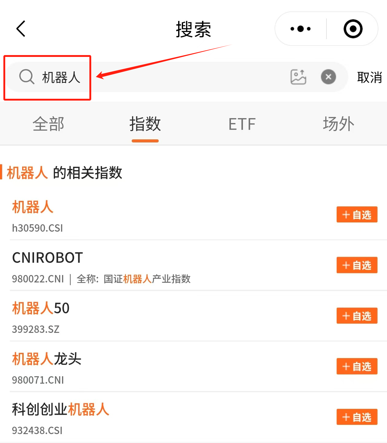 比如科技赛道里,我特别看好机器人接下来的机会,在“红色火箭”的搜索栏里,输入“机器人”,就可以将市场中的机器人指数全部找出来。