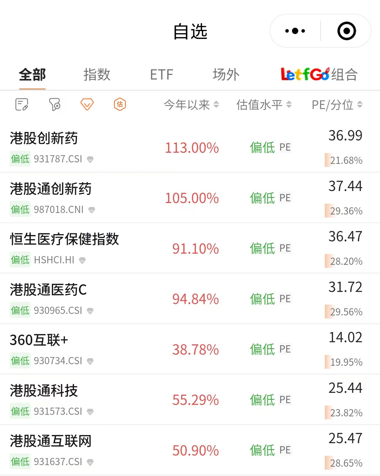 我自己筛了一轮,挖到不少“心头好”,比如港股创新药、港股通科技、港股通互联网等,既是行情主线,又有估值优势,性价比拉满。