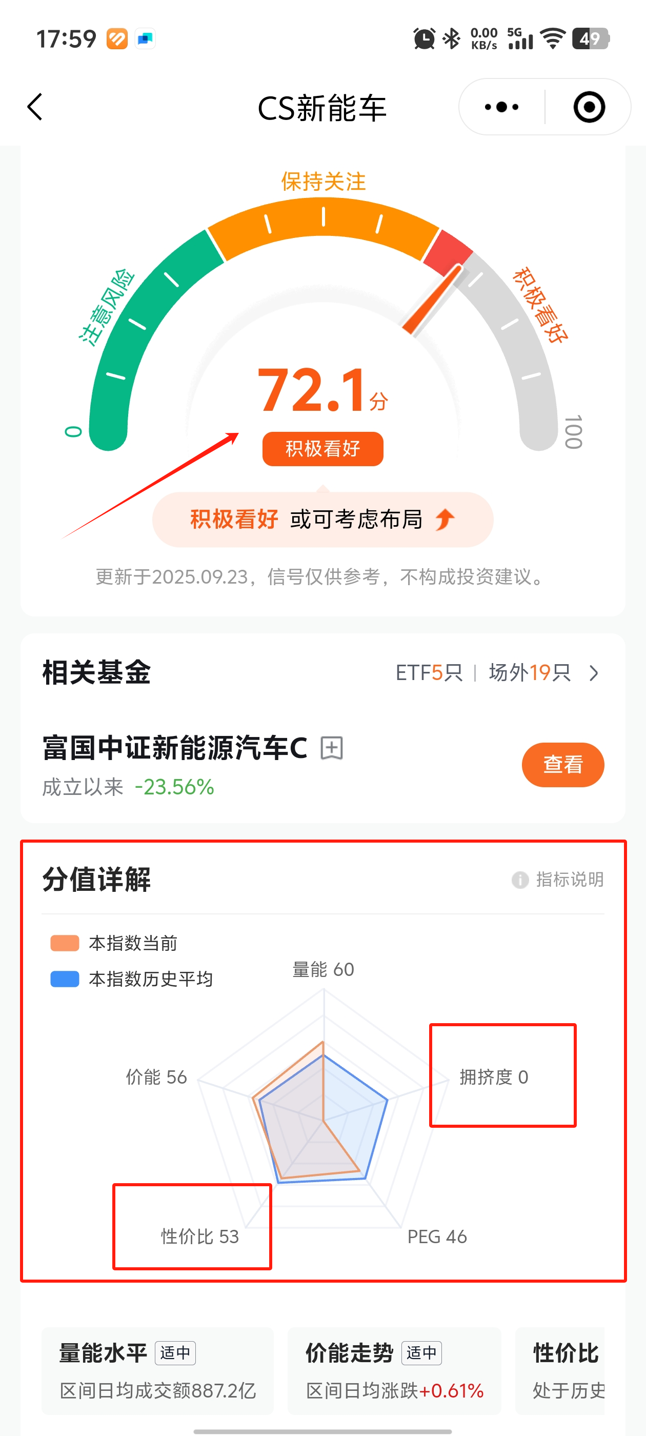 点进CS新能车的详情页,更清楚了:五维分值里,它的性价比处于历史46%的分位,PEG适中(说明基本面不错),拥挤度又非常低,而且量价已经出现回暖,说明资金已经开始进场。