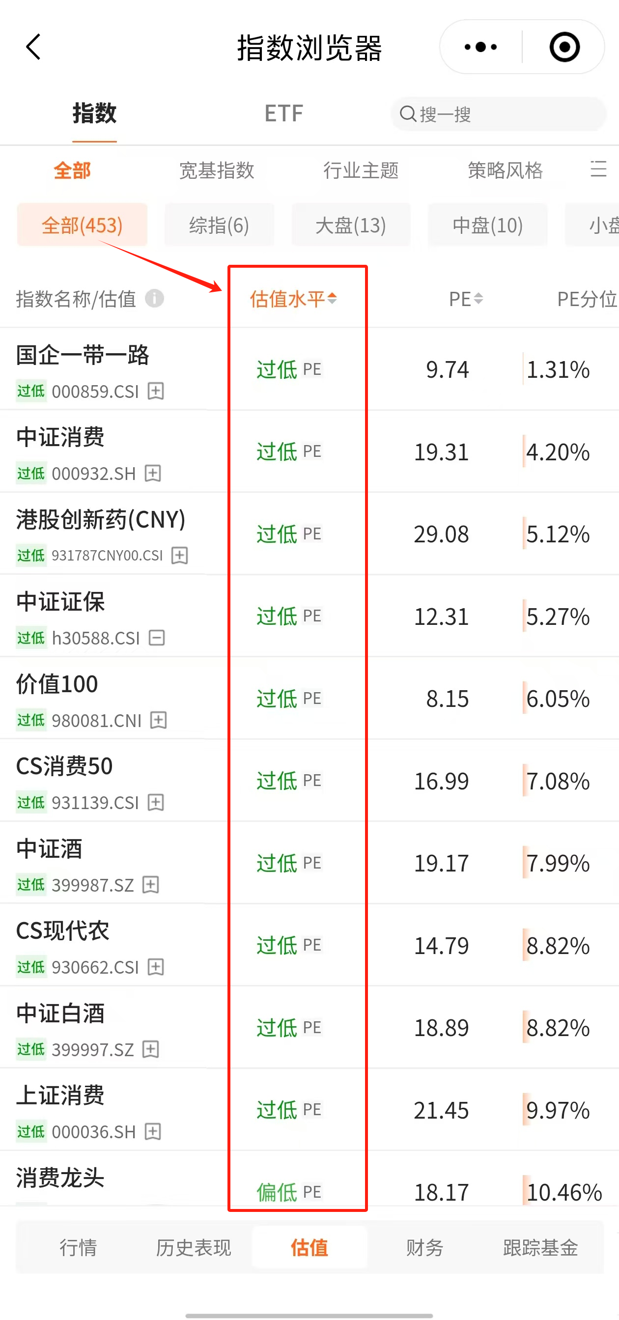 在这个列表里,指数名称下面有两个小字,标注着指数当前的估值是“过高”、“偏高”、还是“适中”、“偏低”、“过低”。一路往下拉,你就会发现惊喜:有些指数近一年涨幅非常靠前,估值却还标着“偏低”。