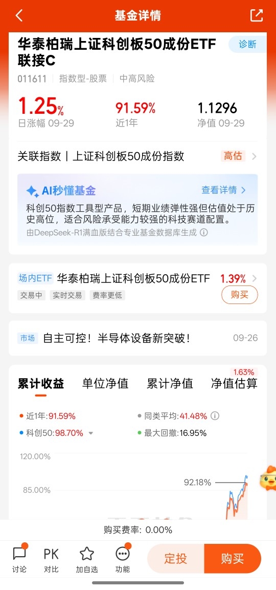 身边买科技股的朋友今天都在晒收益,科创50板块真是强势得没话说!主要是逻辑太:AI、半导体这些领域都是国家重点支持的,国产替代的步子也越来越快,很多公司研发的东西都开始赚钱了。但个股波动实在大,我这种小白不敢乱碰。对比了好几只基金,华泰柏瑞的近期表现让我眼前一亮,今年以来都涨了快50%,上周也跟着指数涨了不少。它能一键打包科创50的优质股,不用自己费心选,就是得记住市场有风险,投资不能盲目冲。