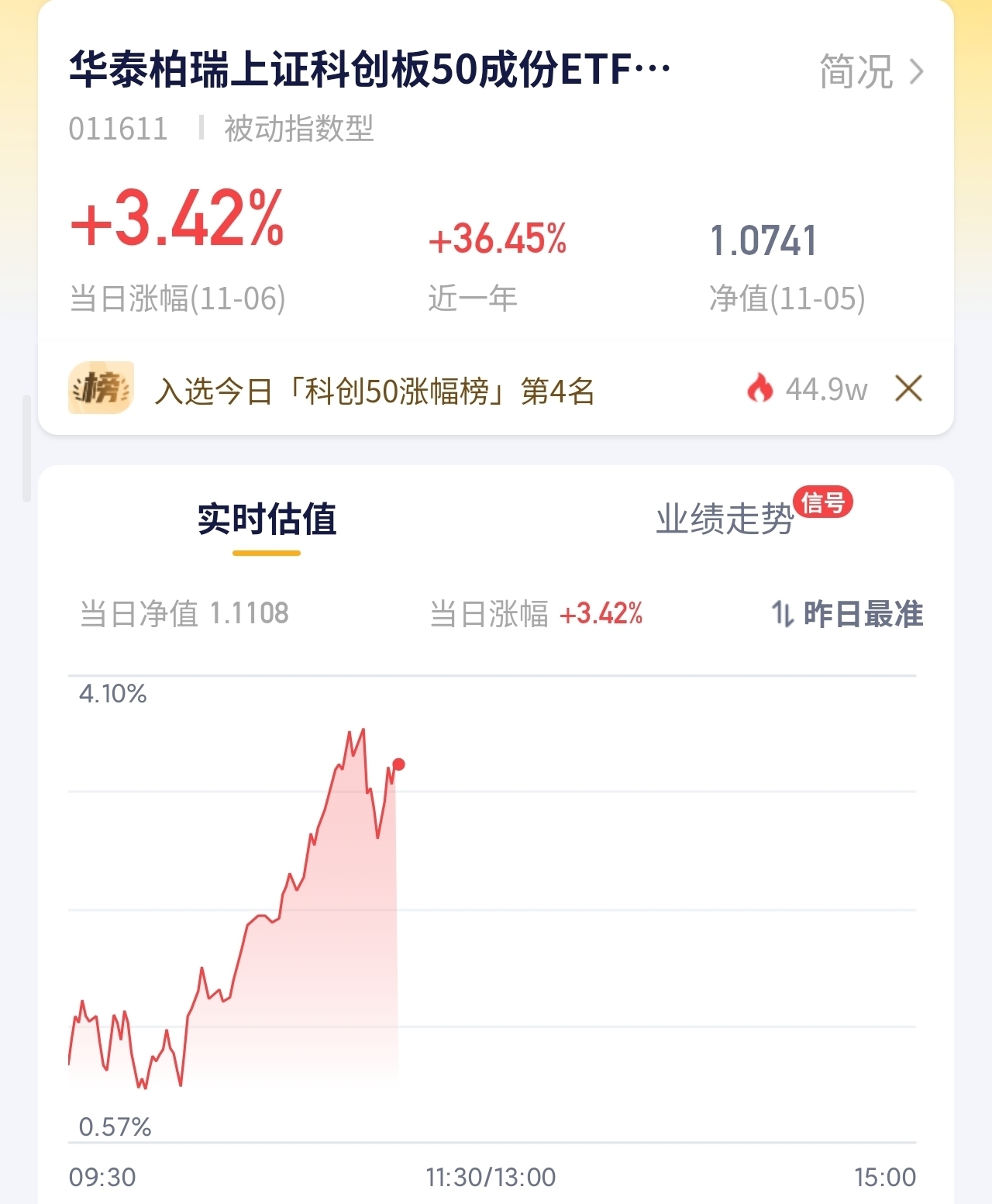 今天科创50可算扬眉吐气了!早上开盘就一路往上窜,中间虽然抖了两下,但收盘还是稳稳飘红——明显是科技小票们在发力。这行情一暖,我就想起华泰柏瑞家那只科创联接C,它就跟着科创50走,现在板块热起来了,拿着它相当于搭上车,关键是买着没门槛,手续费还低,想蹭这波科技热的,这不就是现成的选择嘛。$华泰柏瑞上证科创板50成份ETF联接C$
