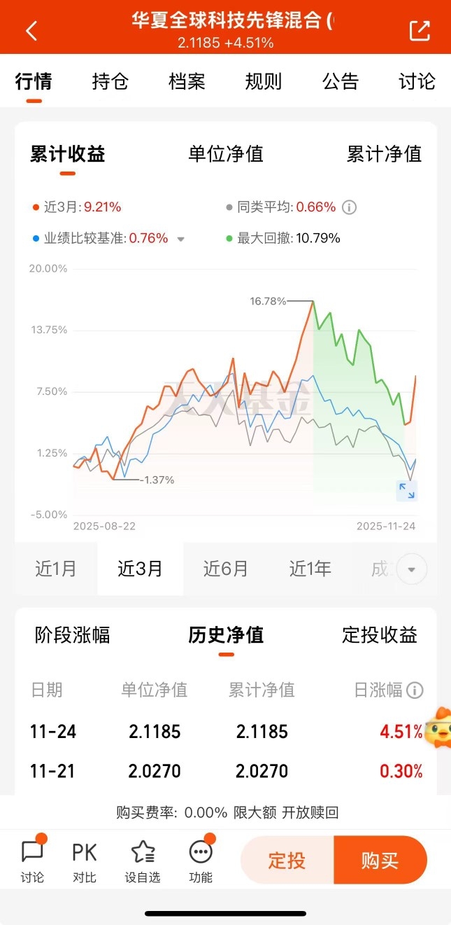 从近几天国内外的科技板块走势看,科技主线地位逐步回归,$华夏全球科技先锋混合(QDII)C$昨天上涨4.51%,估值也不错,四季度收益靠它了,5万的限额不算少,有额度就入
