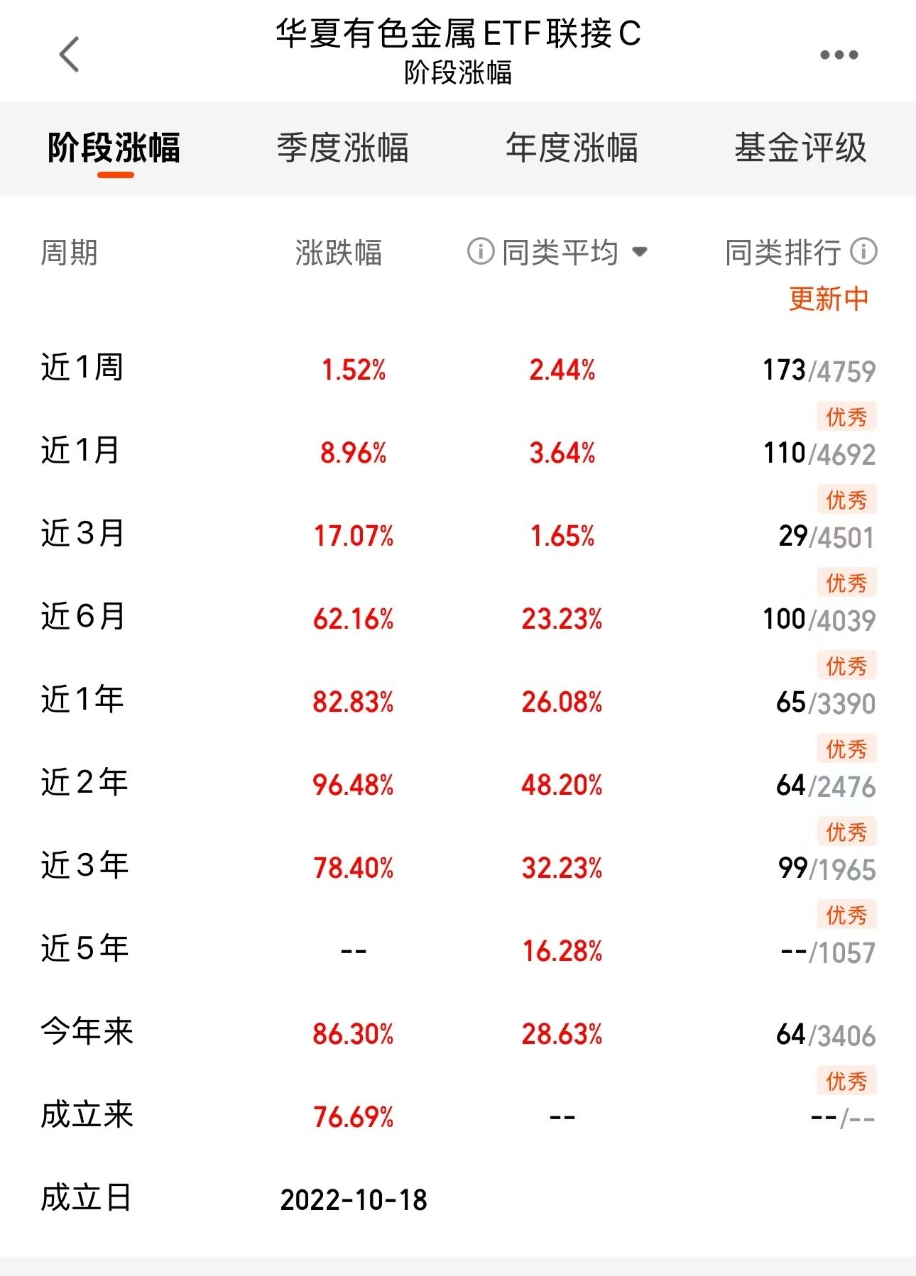 也算是给机会了,明天开门就过来加,今天受市场调整的影响到了,这里整体收益都可以的,各阶段也都保持优秀,近一年也有82%+,反正现在白银限额100买不进去了,这基是最佳选择,D类也有7天免赎$华夏有色金属ETF联接C$$华夏有色金属ETF联接D$