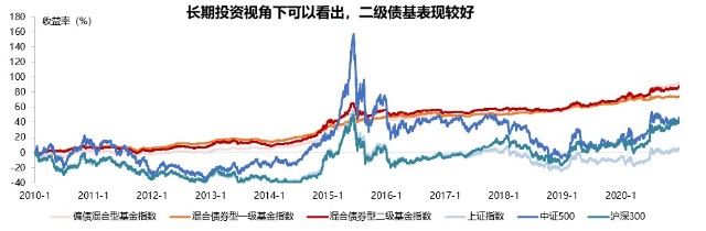 在基金产品中,固收+基金就是一种稳定性较高、回撤可控的产品。比如其中的二级债基(20%股票+80%债券),从2010年到2020年,二级债基指数10年期间的涨幅达到87.9%,最大回撤仅为12%,而同期沪深300的涨幅为46.4%,最大回撤高达46.7%。