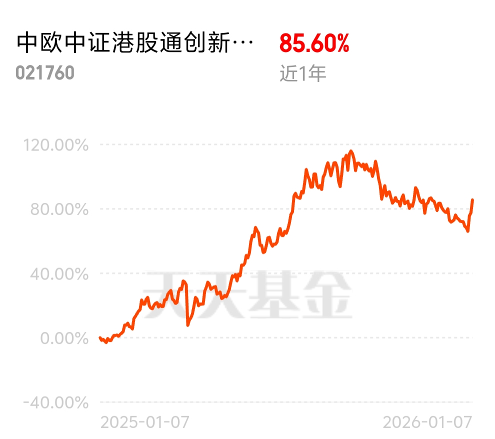 最近科技股行情没个准头,不少人都在找稳健方向,创新药估值现在很划算。中欧中证港股通创新药指数发起 C 近 1 年 85.60%,盯着港股创新药指数,重仓药明生物这些龙头,板块涨起来能稳稳吃收益,当下布局正合适。