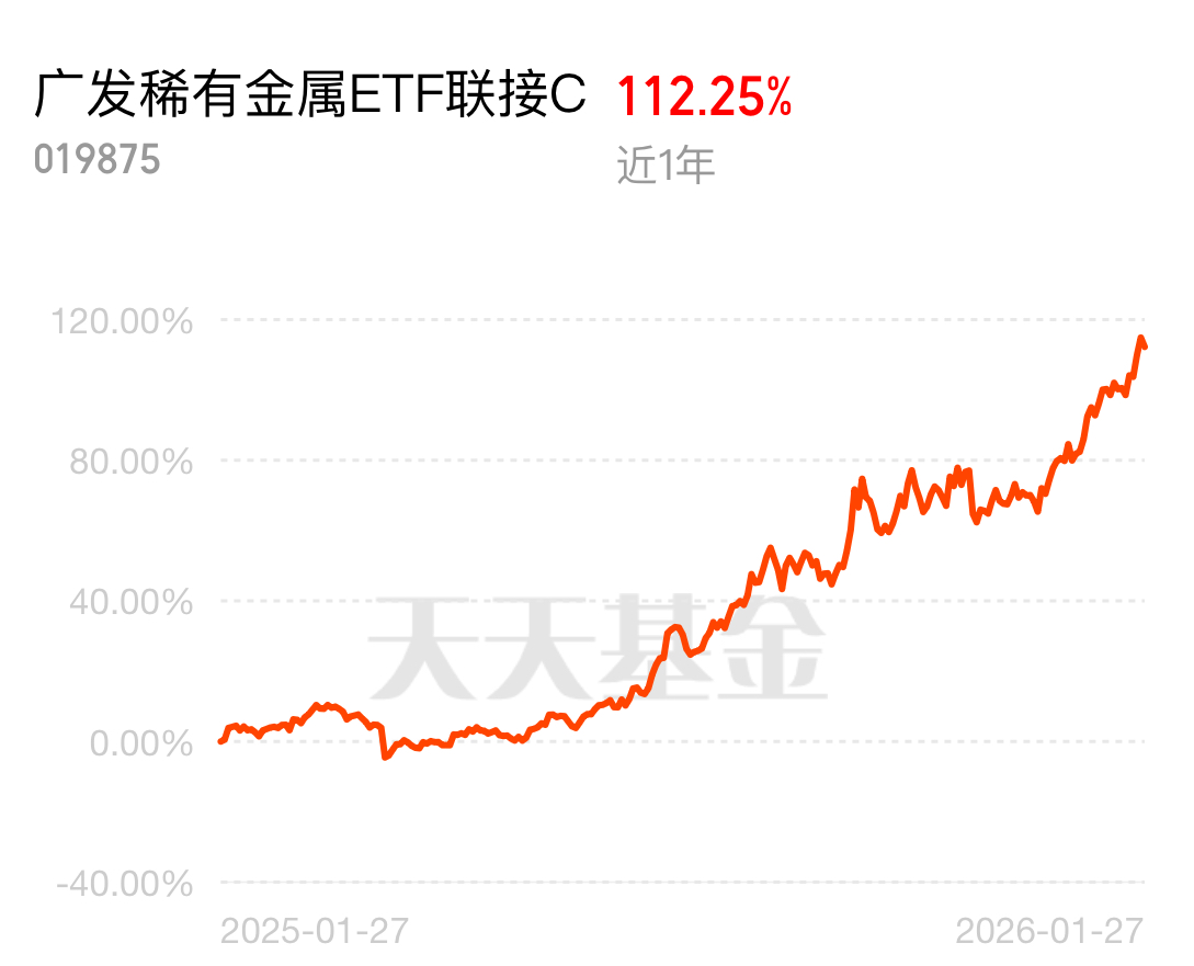 广发中证稀有金属ETF联接C我准续拿稳,近一年好歹112%,还有广发上海金也买了,况且我觉得稀有金属这波要从周期品变成战略资产了。还有以前看供需,现在看地缘政治和供应链安全。价值重估一旦开始,逻辑就不会短$广发稀有金属ETF联接C$