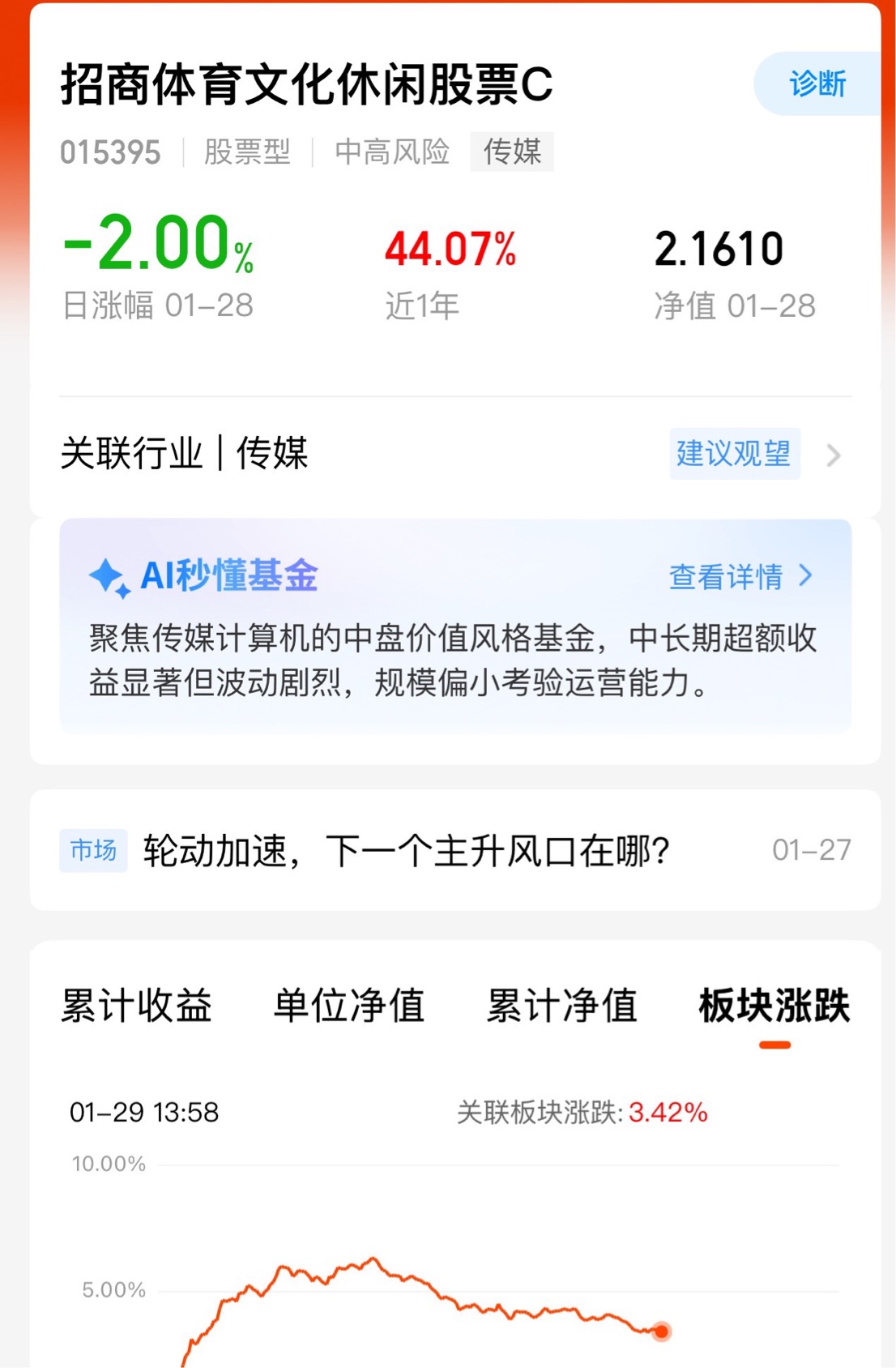 今天大盘尾盘行情拉胯,沪指深成指的涨幅大幅收窄,最后就小涨一点,个股跌得稀里哗啦,足足3500只股票下跌,赚钱效应真的差。$招商体育文化休闲股票C$ 今日传媒板块涨近3%,前期回调的AI应用方向有卷土重来的迹象,近一年上涨44%,不错