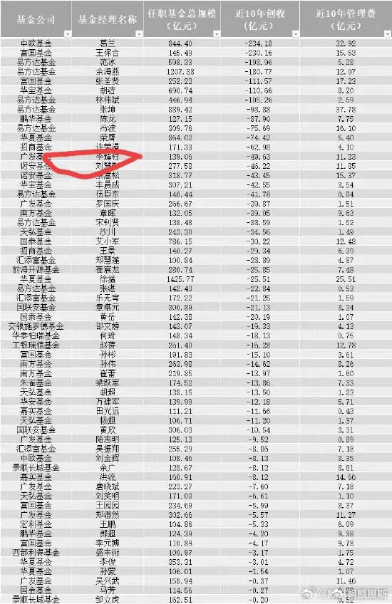 基金亏损的排名第十三名,100多亿,才亏不到50亿,还是收十几亿的管理费 百度出个10年排行榜,你排名挺靠前呀!