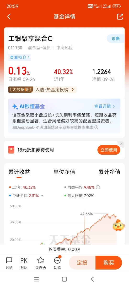 $工银聚享混合C$ 对新手和上班族特别友好,不用费脑子盯盘。纯债基收益太稳但略低,股票基金要天天看涨跌,小盘偏债基刚好卡在中间,债券部分打底,不用担心里程碑式的亏损;股票部分占比不高,就算小盘股短期波动,也不会让账户“绿得心慌”,早上上班前看眼收益,晚上睡前瞄一眼,不用研究K线也不用分析行业研报,适合没精力管钱,但又想比理财多赚点的人。@工银瑞信基金