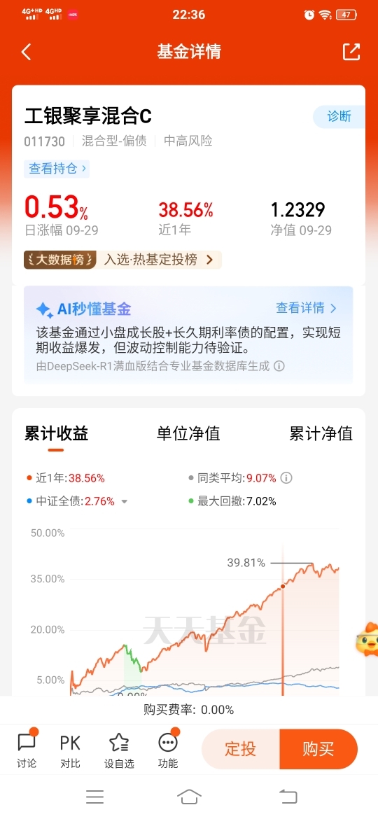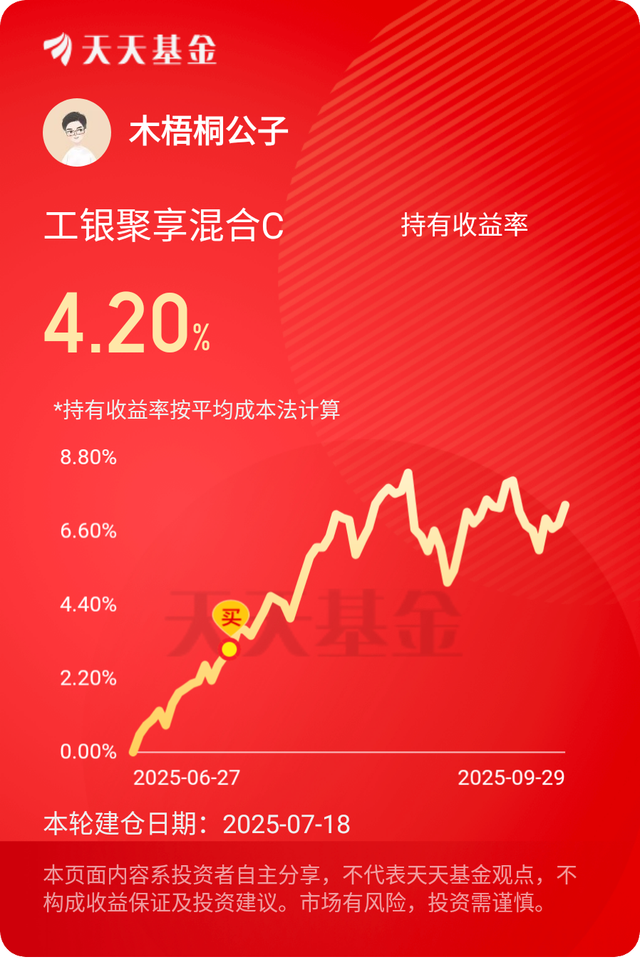 所以综上,工银聚享混合C通过“债券底仓+小盘股增强”策略,在当前行情中展现出“进可攻、退可守”的特性。其超额收益源于量化选股与久期管理的双重驱动,风险控制能力在同类产品中领先。木同学会根据自身风险偏好和投资期限,合理配置并动态调整,以充分享受小盘股结构性机遇,同时规避潜在风险。对于追求稳健成长与波动控制平衡的小伙伴,木同学认为此类产品是构建“安全垫+弹性收益”组合的理想选择。@工银瑞信基金 #晒收益#
