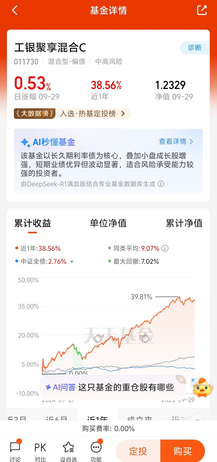 偏债混合型基金凭借股债双轮驱动的特性,成为震荡市中平衡风险与收益的利器。这类产品通常将70%以上仓位配置于债券,通过利率债、高等级信用债获取稳定票息收益;剩余20%-40%仓位投向股票,捕捉成长赛道红利。以工银聚享混合为例,其近一年收益率达39.22%,同期基准收益仅8.83%,在同类基金中位居第一,远超纯债基金与偏股基金的平均表现。