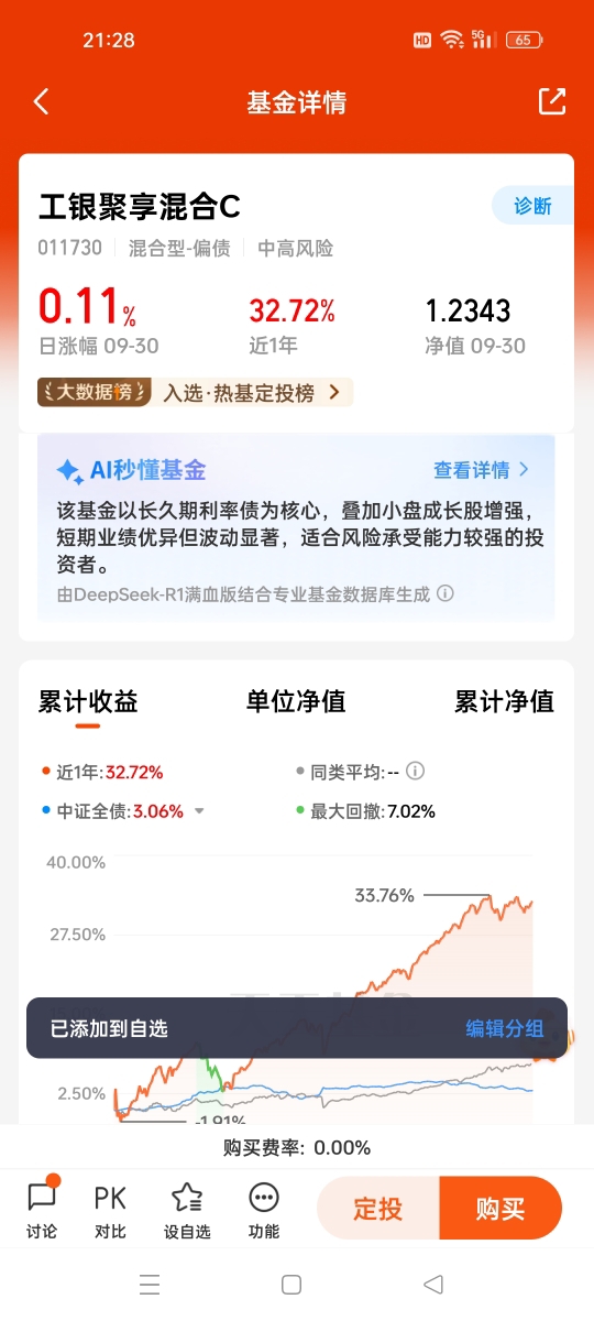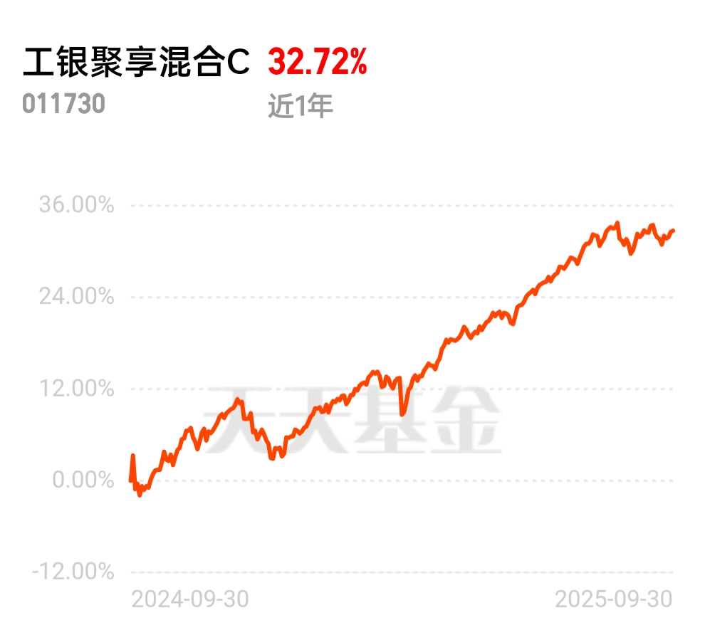 #天天基金13岁啦# 在偏债混合基金普遍以“5%+收益”为目标的市场中,$工银聚享混合C$ 近一年超35%的净值增长堪称“异类”——更难得的是,它以“偏债”为基,却在权益端走出媲美部分权益基金的弹性,还能将最大回撤控制在7%以内,稳居同类第一。这种“稳中有进”的表现,不仅是产品策略的胜利,更折当前市场对“平衡型资产”的迫切需求,而基金经理的能力适配、行情的精准踩点,更是缺一不可。