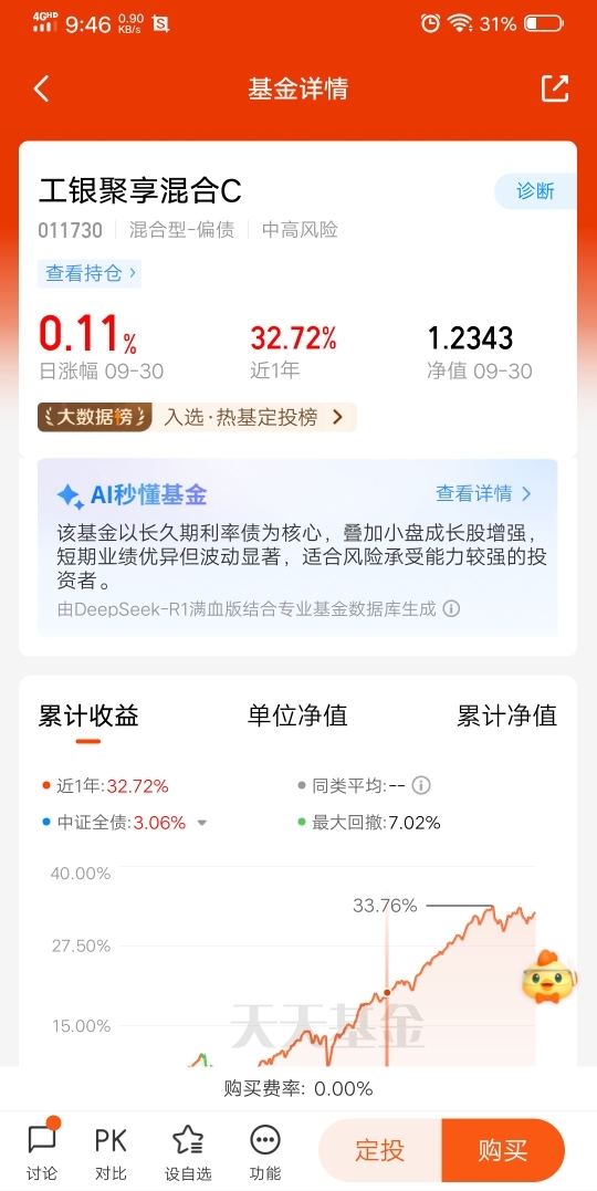 #天天基金13岁啦# 第37天,从$工银聚享混合C$ 到深入研究其的策略、业绩、风险控制,我越来越坚定持有的理由。首先是业绩过硬,近1年同类第1、近2年同类第2,还有三年期五星评级,长期表现稳定且领先,这是我选择基金的核心标准;其次是策略适配市场,“债券打底+权益小盘增强”既应对了当前结构性行情,又满足了我“稳中有进”的投资需求;最后是风险控制到位,分散配置+债券平滑波动,让我能安心持有,不用天天盯盘。