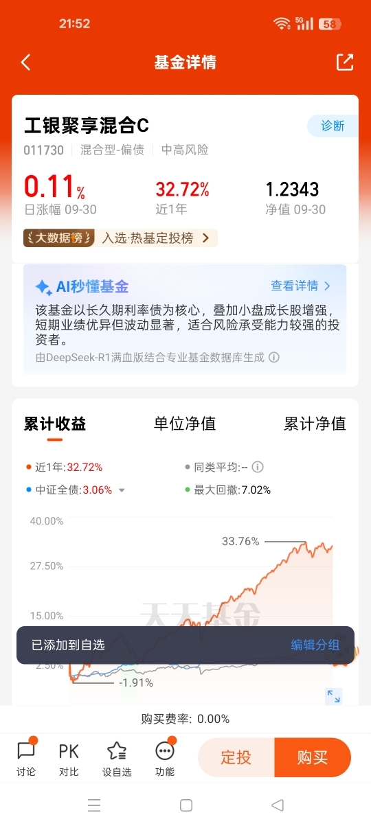 此外,产品的费率设计也极具吸引力。工银聚享混合C作为C类份额,无申购费,持有满30天免赎回费,大幅降低了投资者的交易成本,尤其适合中长期持有。对比同类产品1.5%的申购费与0.5%的赎回费,工银聚享混合C的费率优势显著,进一步提升了投资者的实际收益。
