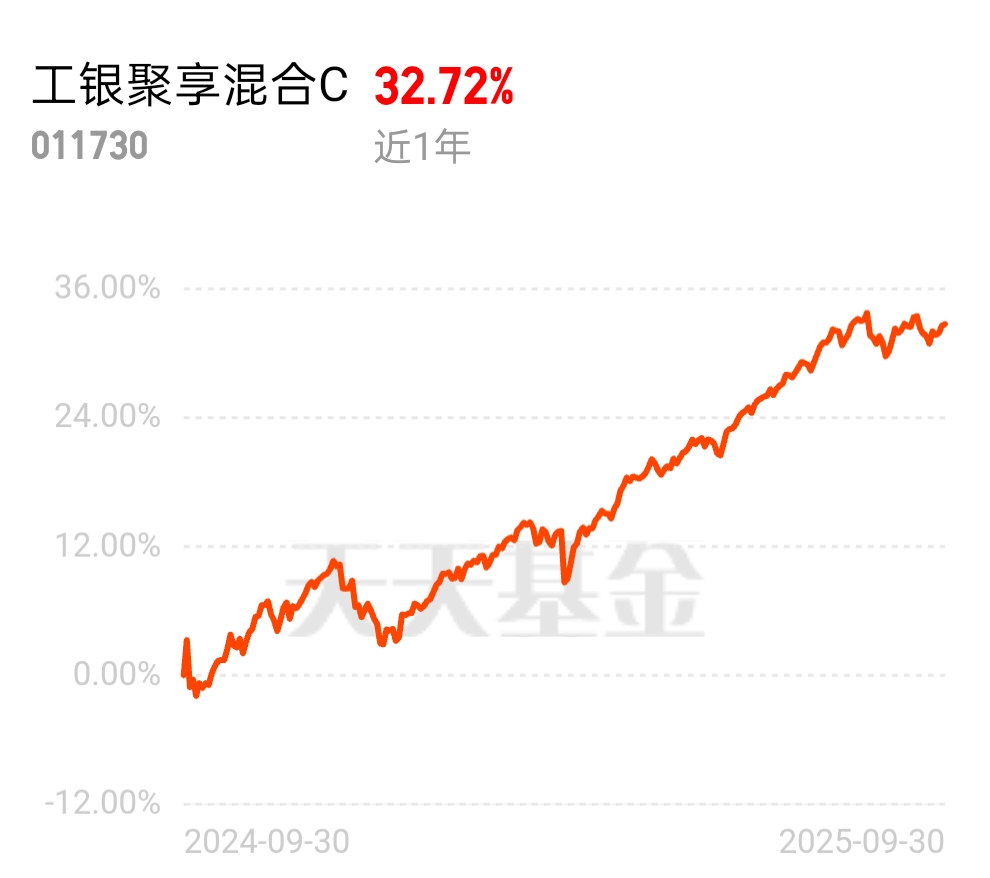 #天天基金13岁啦# 在当前资本市场“结构性机会凸显但波动未减”的环境下,投资者普遍面临两难选择:若重仓权益基金,需承受净值大幅震荡的风险;若固守纯债基金,又难以满足资产增值的需求。而$工银聚享混合C$ (011730)以“债券打底,权益增强”的偏债混合定位,恰好成为破解这一困境的关键工具——它既能凭借债券资产平滑组合波动,又能通过权益配置为纯债投资者提升收益弹性,叠加近一年超35%的净值增长、同类排名第一的硬业绩,在四季度市场可期的背景下,更显配置价值。