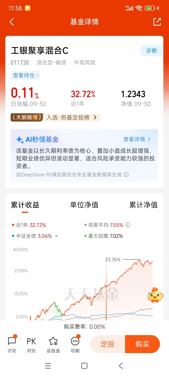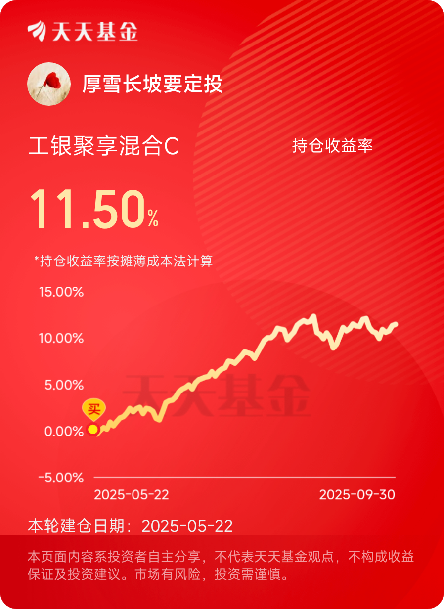 #天天基金13岁啦# 行情演绎必然会面临各种波折,而“固收+”正是抚平这些波折的一剂良药。持有工银聚享这半年,恰似一场静水深流的修行。当初选择这款"固收+"产品,是看中它债券打底、权益增强的平衡之道。基金经理多年的量化投资经验与团队成熟的风控体系,让我在众多基金中找到一个避风港。记得有一段时间,净值在震荡中徘徊。看着账户上的浮亏,说不焦虑是假的。但我注意到基金的持仓结构始终稳健,债券部分提供稳定收益,权益部分虽然短期波动却保持着合理分散。这份坚守终于等来了转机,随着市场回暖,基金净值稳步回升,最终带来了超过预期的回报。这段经历让我改变了以往的投资习惯。曾经每个交易日都要反复查看净值波动,现在学会以更从容的心态看待短期变化。基金通过严格的股债配比实现的平稳增长,让我真正理解了"慢就是快"的智慧。财富的积累需要耐心,就像园丁培育苗木,过分关注反而打乱生长节奏。如今,我更加信任工银瑞信这家老牌基金公司。他们专业的投研团队和严谨的风控体系,让我对基金的未来充满信心。在投资这条路上,我期待与工银聚享继续相伴,见证时间带来的复利奇迹。