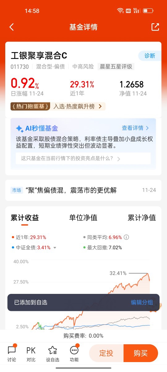 工银聚享混合以“量化+固收”的双轮驱动策略,精准击中了震荡市的投资痛点。不同于传统固收+产品依赖主观判断的权益配置模式,该基金通过量化模型对市场情绪、行业轮动、个股估值等多维度数据进行实时分析,既能高效捕捉市场中的结构性机会,又能通过严格的风险控制规避单一标的波动风险。这种“量化赋能+固收托底”的组合,让基金在保持较低回撤的同时,实现了收益的高效兑现——近1年32.72%的净值增长率,以及同类排名前2%的成绩,不仅是数据的亮眼呈现,更印证了量化策略在震荡市中的实战价值,尤其适合追求“精准收益”且风险承受能力中等的投资者。