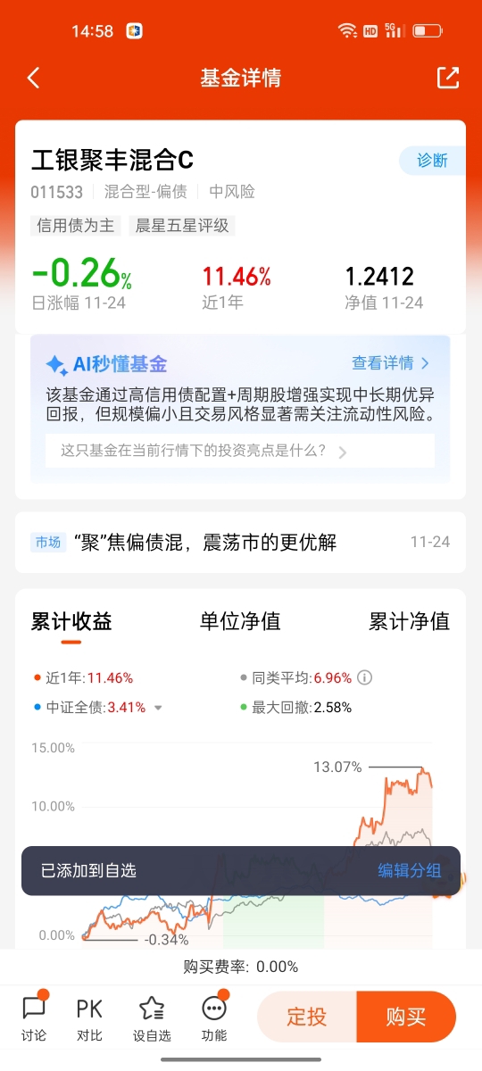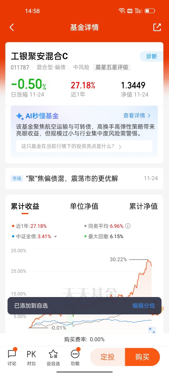 工银聚安混合则以“低估价值+固收+港股配置”的多元布局,拓宽了收益的边界。在当前市场估值分化的背景下,“低估价值”策略本身就具备较强的安全边际,而该基金进一步将投资视野延伸至港股市场,借助港股与A股的低相关性,实现了跨市场的风险分散。从业绩表现来看,其C类份额近1年21.47%的净值增长、同类前3%的排名,既体现了低估价值标的的估值修复潜力,也验证了港股配置对收益的补充作用。对于希望在稳健基础上,适度分享港股估值回归红利的投资者而言,这只基金无疑提供了优质的配置工具。