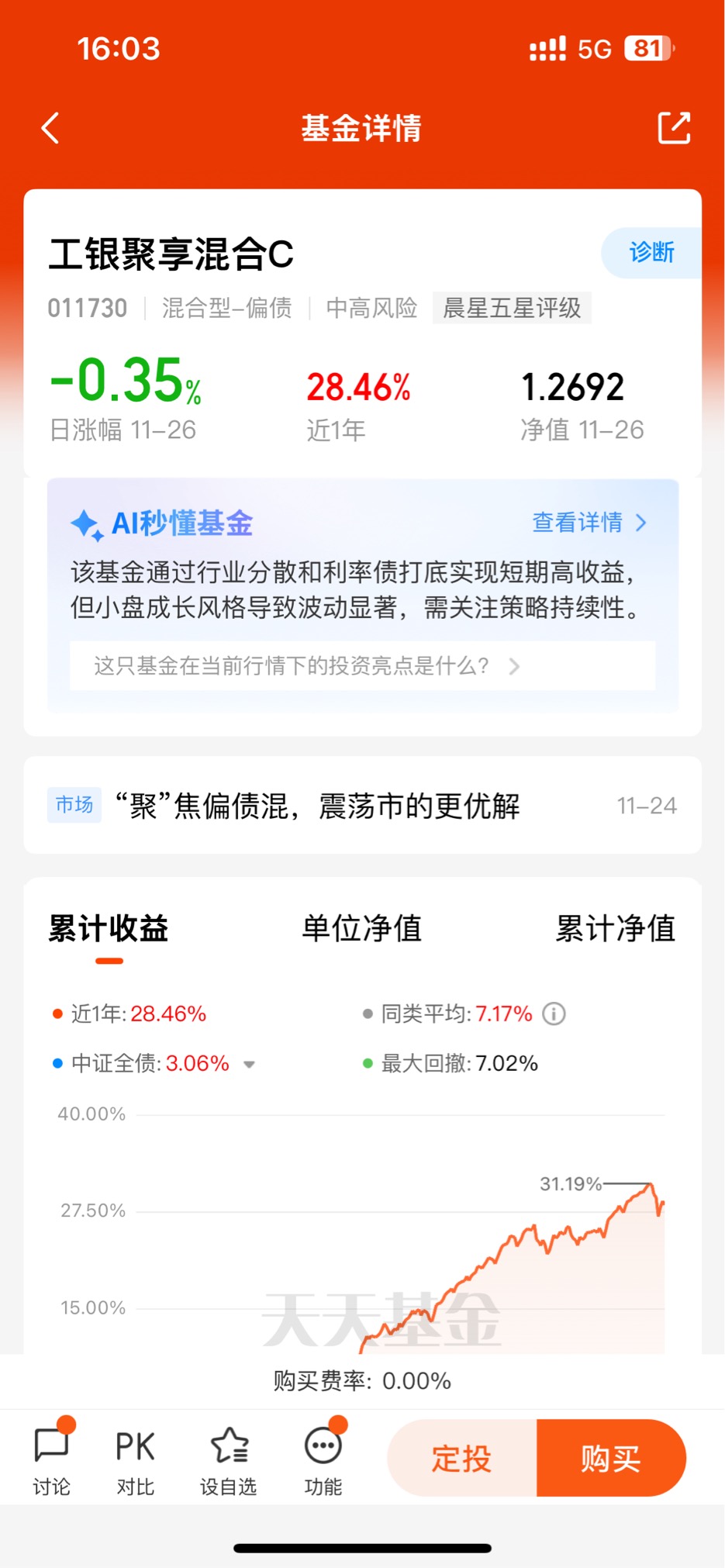 作为一名偏爱“稳中求进”的投资者,我踩过不少单一资产波动的坑,直到遇见工银聚享混合C,才找到契合需求的配置选择。这款基金既没有纯债基金的收益局限,也没有纯权益基金的剧烈波动,凭借清晰的策略逻辑、贴心的产品设计和专业的管理团队,成为我持仓中安心度最高的资产之一,其未来走势也让我充满信心。