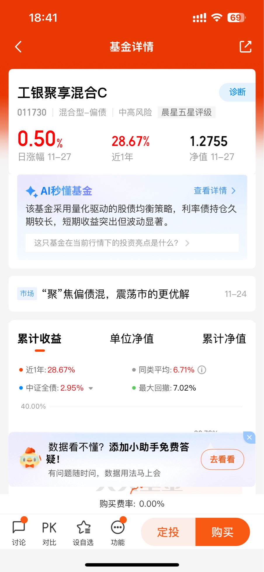 当然,市场波动在所难免,中小盘股也可能面临估值波动的风险,但凭借基金完善的风控体系和灵活的调仓能力,这些风险大概率能被有效控制。对追求稳健增值的投资者来说,工银聚享混合C既有债券的稳,又有成长股的锐,还有专业团队和友好设计加持,无疑是震荡市中穿越周期的靠谱选择。我已将它作为核心持仓长期持有,相信在时间的复利效应下,能持续创造可观的收益。