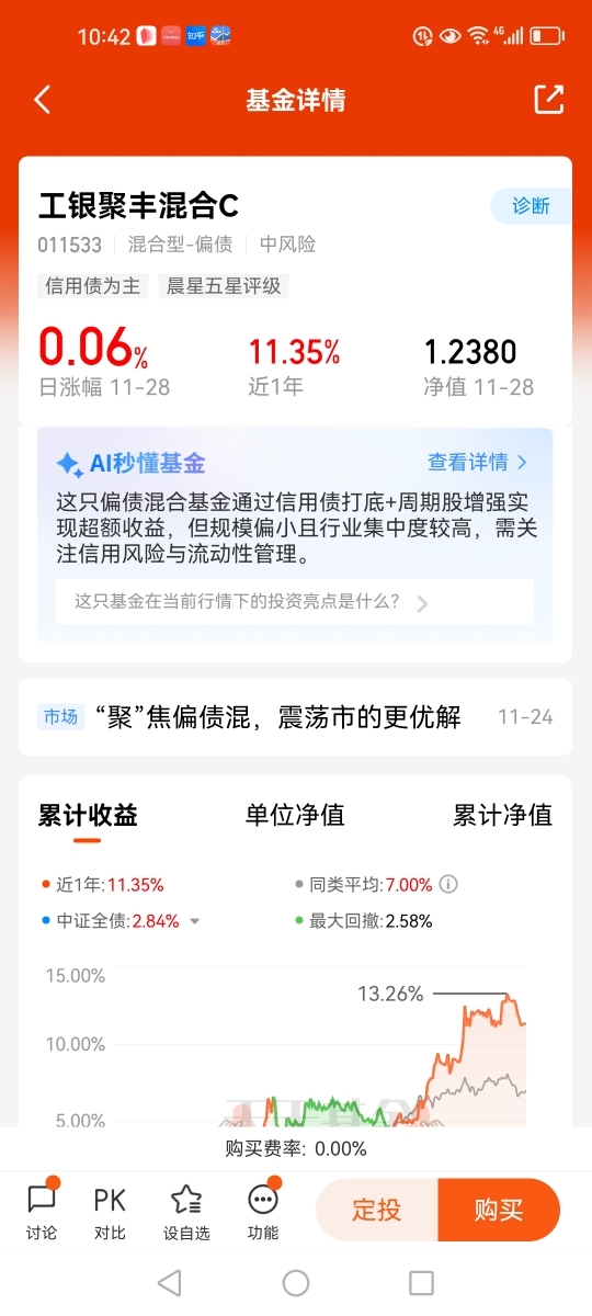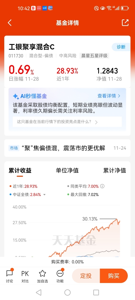 截止到11月28日,$工银聚享混合C$今年以31.16%的收益,在同类排行前1%(11/1298),业绩表现亮眼。本人非常看好$工银聚享混合C$,已加入自选,并重点关注。@工银瑞信基金