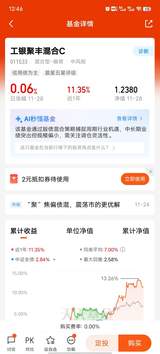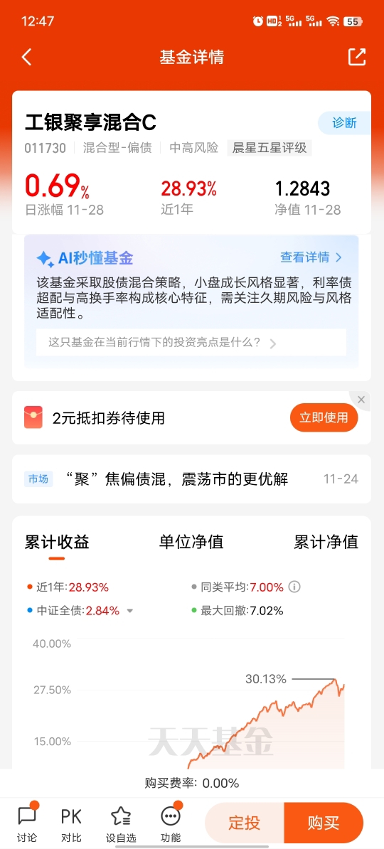 打卡第二天,国内目前已进入低利率时代,银行定存利率已经不足2个点,把钱放入银行已经没有任何意义,固收+类产品我们或许可以选择。$工银聚享混合C$ 是一支偏债的混合型基金,今年以来已上涨20.19%,收益率远远跑赢银行定存利率。基金经理黄诗原,该基金任期2年又28天,任职回报48.98%,2年收益率接近50个点,这样的收益率可以吊打银行定期存款。@工银瑞信基金