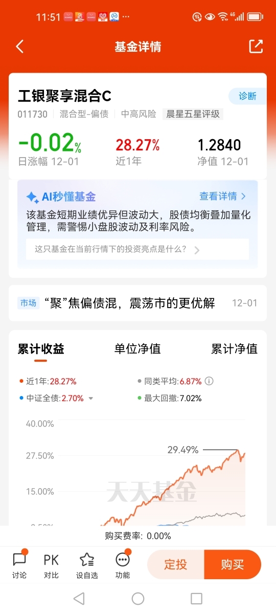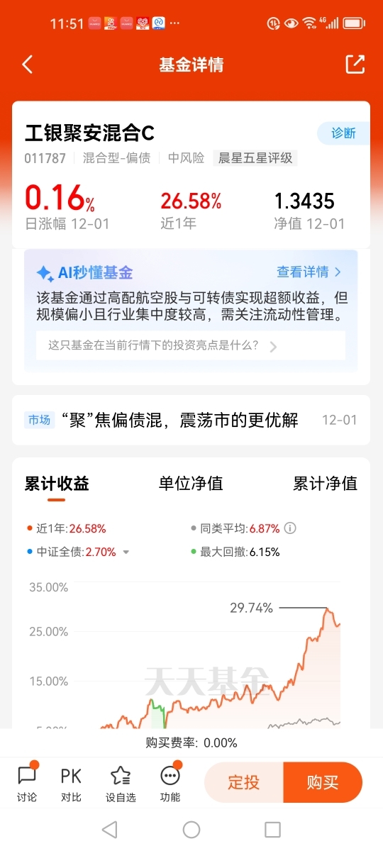 打卡第四天。近一年A股震荡上行,大盘指数并突破4000,而混合型-偏债$工银聚享