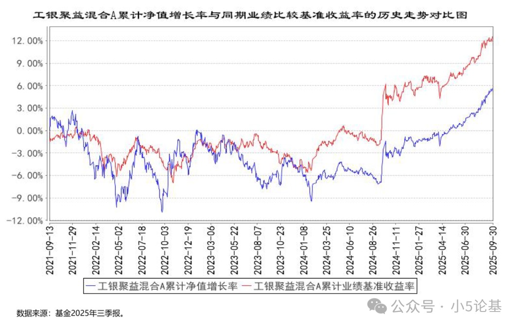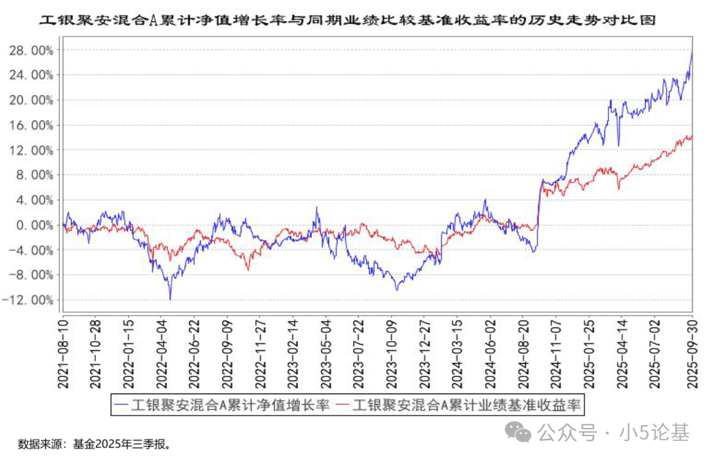 从收益的角度来看,截至2025年9月30日,工银聚益混合A过去一年的累计总回报为8.47%,相较于同期业绩比较基准7.60%有一定超额。