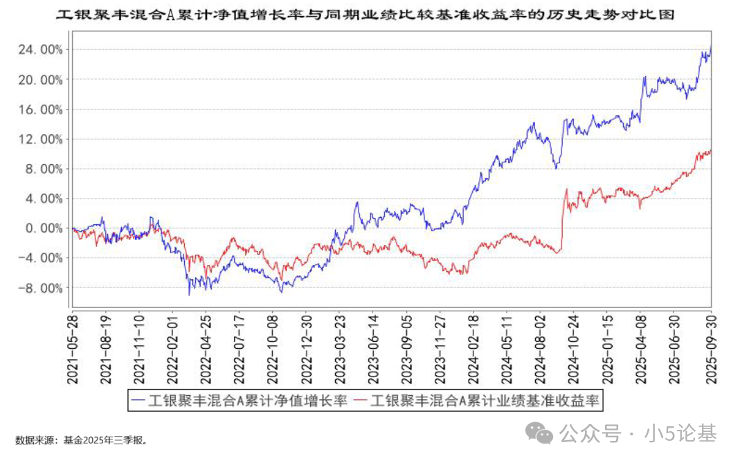 从收益的角度来看,截至2025年9月30日,工银聚丰混合A过去一年和过去三年的累计总回报分别为9.08%和33.72%,同期业绩比较基准分别为6.95%和16.64%,超额收益较为显著。