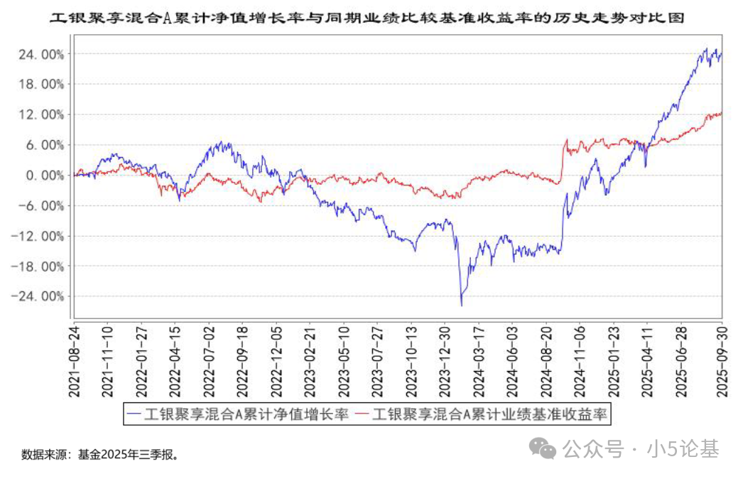 从收益的角度来看,截至2025年9月30日,工银聚享混合A过去一年的累计总回报为33.25%,不仅超额收益极为显著(同期业绩比较基准为6.95%),其排名更具看点,近一年、两年均居于同类前5(近一年排名为4/255,近两年排名为3/254)。(注:排名数据来自银河证券,数据均截至2025年9月30日,同类为“混合基金-偏债型基金-普通偏债型基金(股票上限高于30%)(A类)”。)