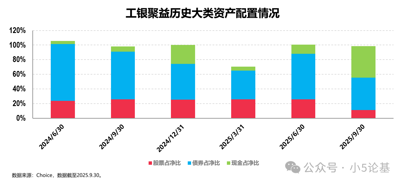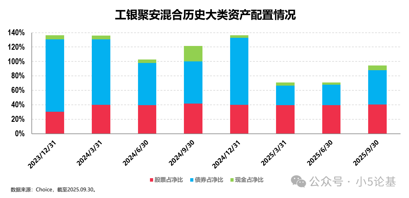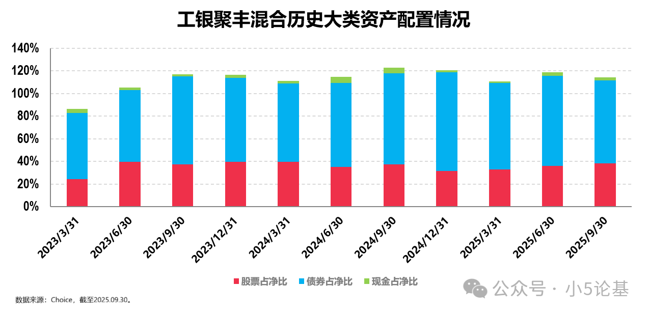 从历史持仓数据来看,自2024年二季度至2025年三季度,工银聚益混合的平均股票(含港股)仓位为22.86%,平均债券仓位为56.42%,股债仓位均会做一定调整。最新的2025年三季报显示,其股票(含港股)仓位为11.16%,债券仓位为44.17%。(数据来源:基金各定期报告,股票、债券仓位为占基金资产净值的比例。)