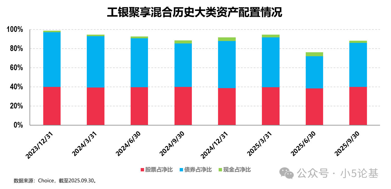 从历史持仓数据来看,自2023年四季度至2025年三季度,工银聚享混合的平均股票仓位为39.31%,平均债券仓位为48.58%,历史股债仓位(特别是股票仓位)比例相对稳定,是一只典型的偏债混合产品。最新的2025年三季报显示,其股票仓位为39.82%,债券仓位为46.15%。(数据来源:基金各定期报告,股票、债券仓位为占基金资产净值的比例。)