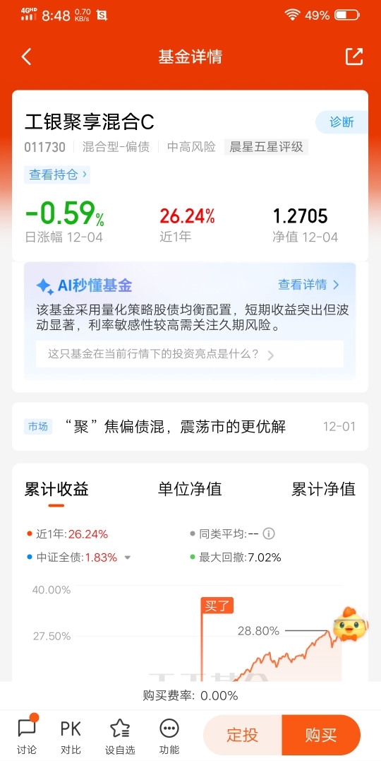 再看固收部分的支撑作用。债券资产本身具有收益稳定、风险较低的特点,$工银聚享混合C$ 将大部分资产配置于债券,为基金提供了坚实的收益基础。即使在权益市场大幅波动的情况下,债券部分的收益也能平滑基金净值的波动,让投资者拥有更好的持有体验。这种“债券打底,权益增强”的结构,就像给投资加了一层“防护盾”,既保证了基本收益,又保留了收益增长的弹性。$工银聚享混合C$