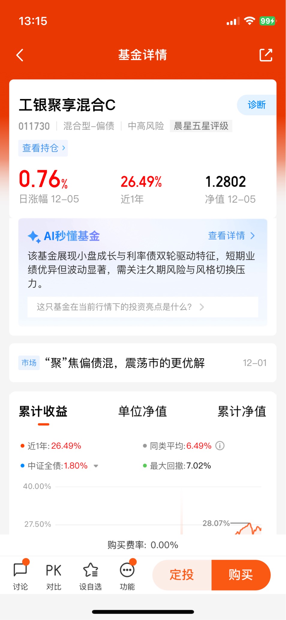 #工银聚焦偏债混#量化+固收$工银聚享混合C$ 在近些年市场频繁震荡背景下,固收+这类凭借“固收打底、权益增强”的策略品种,逐渐成为越来越多投资者的投资理财新选择之一。这一策略的核心在于,债券部分贡献基础收益、控制回撤,权益部分则力争提供向上的弹性空间,力求在震荡市中获得一种收益与风险的平衡。