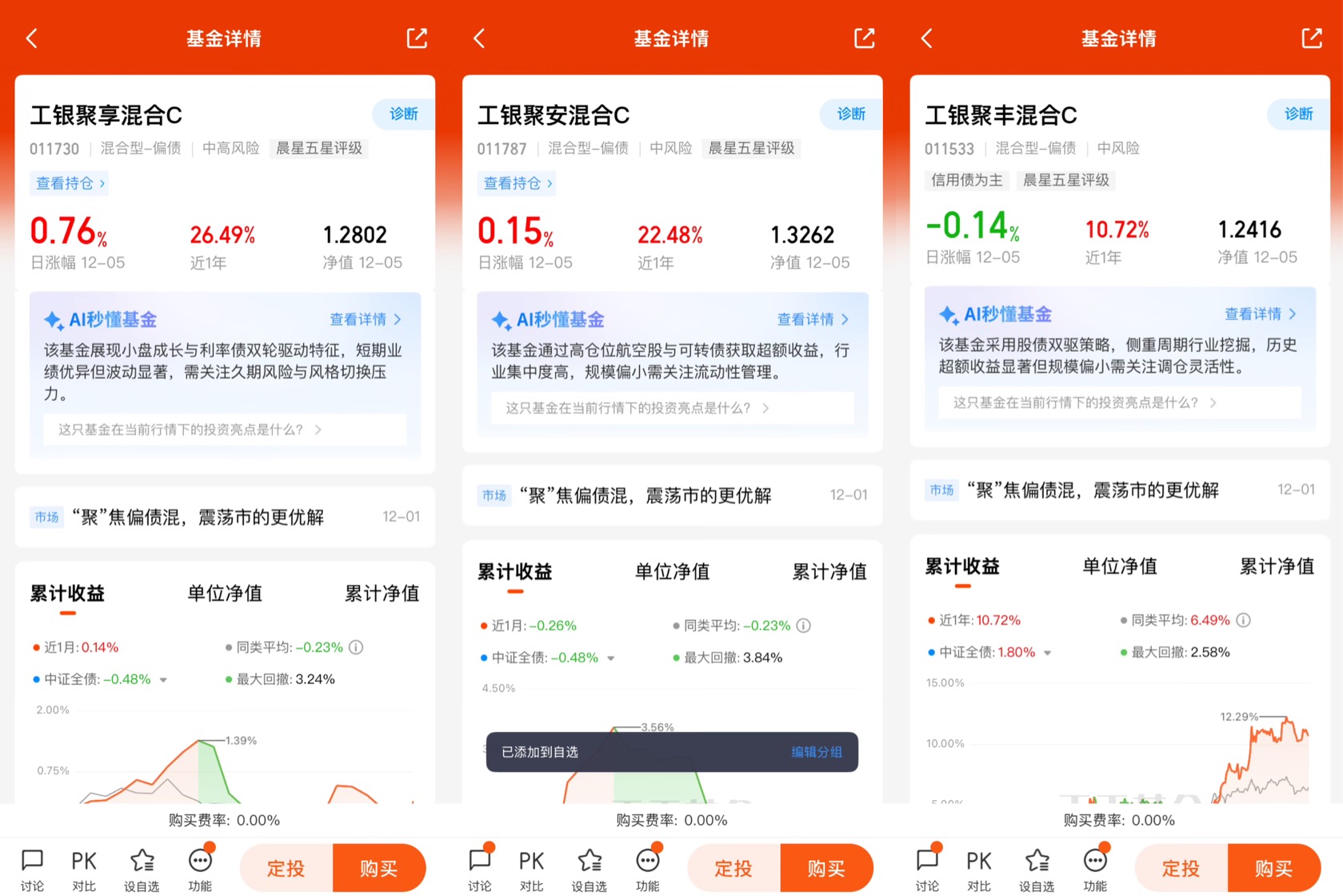 $工银聚享混合C$ $工银聚安混合C$$工银聚丰混合C$ 工银瑞信旗下这三只“聚”系列偏债混合基金,债券打底,权益增强,业绩表现都非常出色,稳居同类基金前列,都荣获了晨星五星评级,是低利率环境下追求稳健收益的优选,也是震荡市场背景下资产配置的减震器!