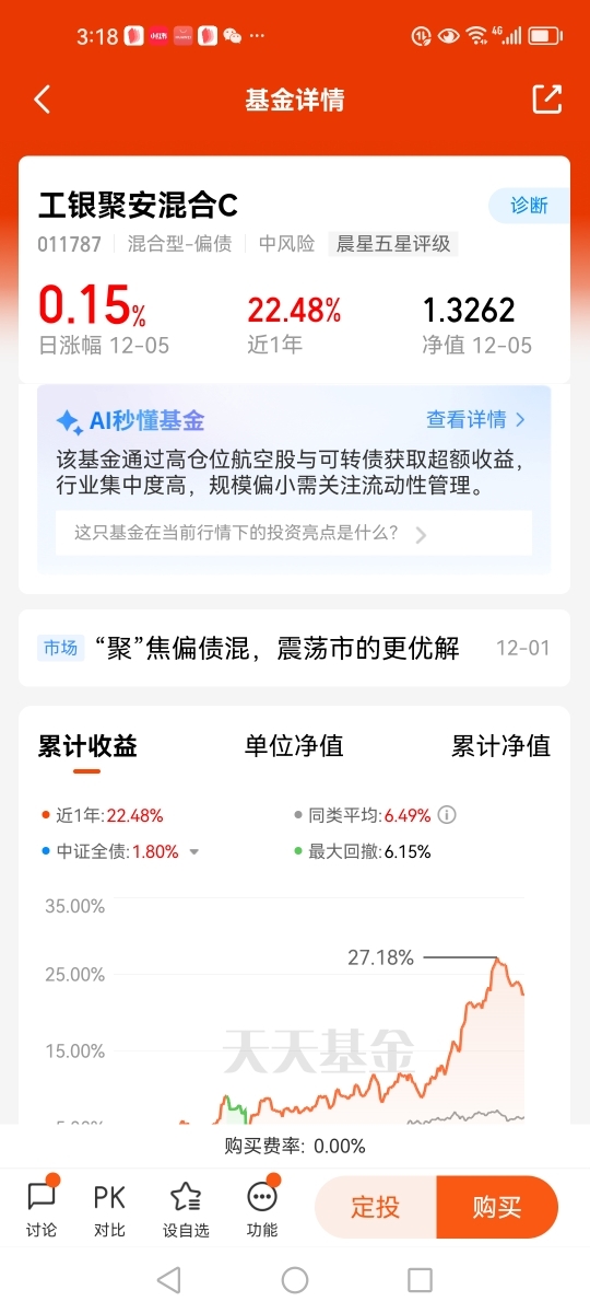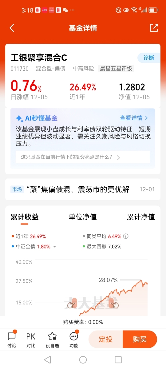 #工银聚焦偏债混#打卡第九天。近期A股市场持续震荡回调,债市整体波动大于前两年,债市利率下行空间不断压缩,收益体验变差。在低利率环境和股市波动加剧之下,$工银聚享混合C(011730)$这只混合型-偏债基金从今年基金3季报来看,基金债券持仓占比46.15%,股票持仓占比39.82%,3季度涨幅6.95%,中证全债指数涨幅-1.12%,大幅跑赢中证全债指数,同类排行236/1361,业绩表现优秀。在目前A股围绕4000点上下拉锯战的行情下,投资者根据个人风险承受能力,不妨配置股债搭配、攻守兼备的$工银聚享混合C$。@工银瑞信基金
