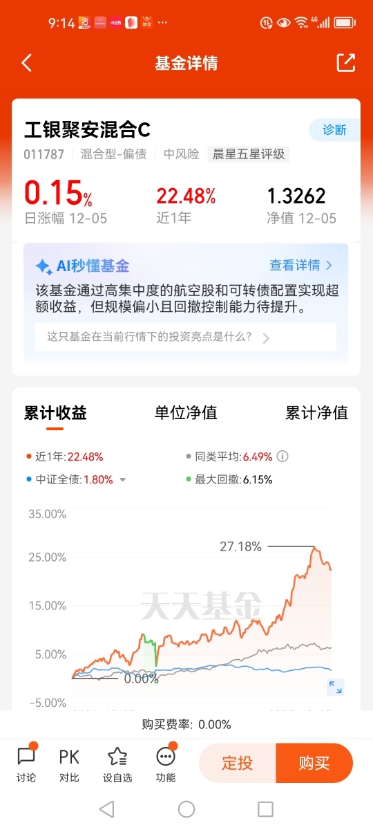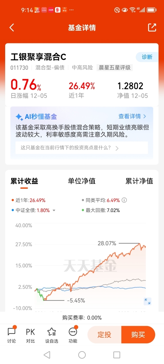 #工银聚焦偏债混#打卡第十天。$工银聚享混合C(011730)$是一只混合型-偏债基金,以46.15%优质债券仓位打底,获得稳健收益;以39.82%股票仓位参与权益增强,获得超额收益。截止目前,该基金近1年收益率达26.49%,同类平均收益为6.49%,在同类排行15/1286,业绩表现优秀。