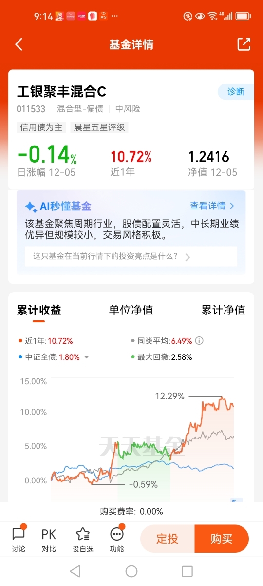 打卡第十天。$工银聚享混合C(011730)$是一只混合型-偏债基金,以46.1