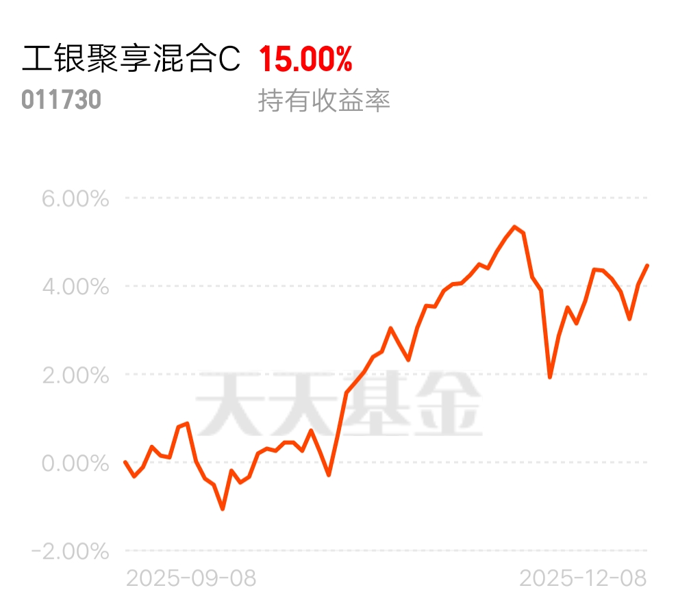 其次,在权益资产的配置上,工银聚享采用“定量化筛选+分散配置”的逻辑,既保证了收益弹性,又有效控制了风险。通过量化模型筛选出的标的,往往具有估值合理、盈利能力强、成长潜力大等特点,能够为基金带来超额收益。同时,基金在权益部分进行了广泛的分散配置,覆盖多个行业、多个标的,避免了单一行业或个股的黑天鹅事件对基金净值的冲击。这种分散化的持仓,让基金在享受市场上涨红利的同时,有效降低了非系统性风险。$工银聚享混合C$