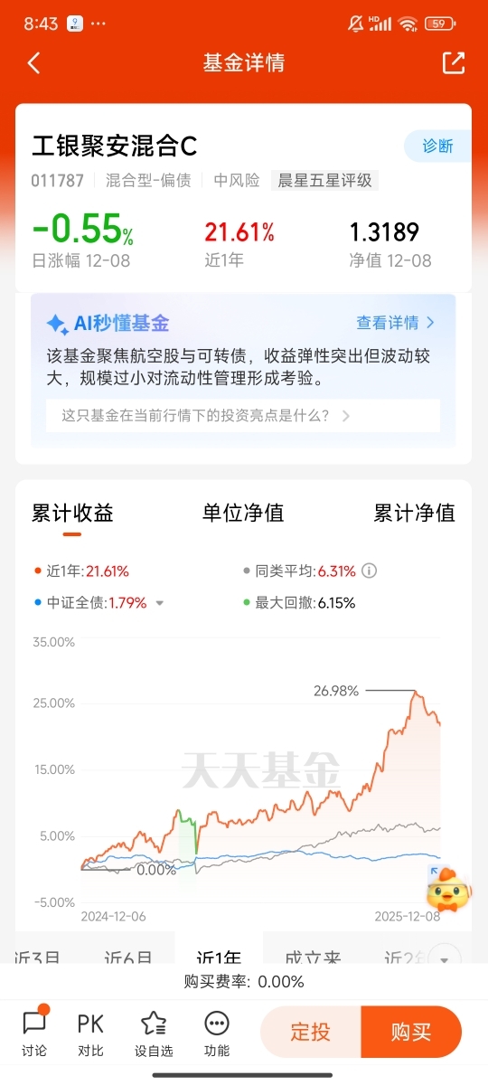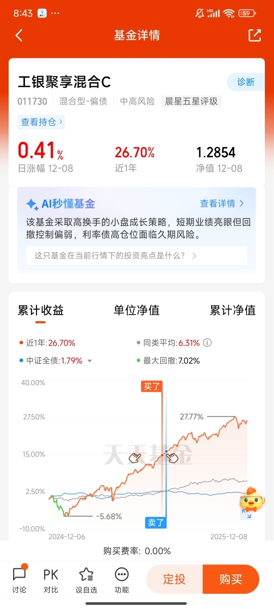 从收益表现来看,这只基金的业绩在同类产品中表现突出。近期A股整体呈现震荡格局,该基金依旧保持着稳定的正向收益,单日净值波动中不乏亮眼的上涨表现。拉长时间维度,无论是短期的月度回报,还是中长期的年度收益,都大幅领先于同类偏债混合型产品的平均水平,在市场回暖阶段能紧跟行情节奏,在调整阶段也能守住收益成果,完美契合投资者“稳健增值”的核心需求。