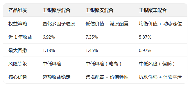 单一产品选择:风险偏好低选工银聚丰,追求超额收益选工银聚享,看好价值+港股选工银聚安;
