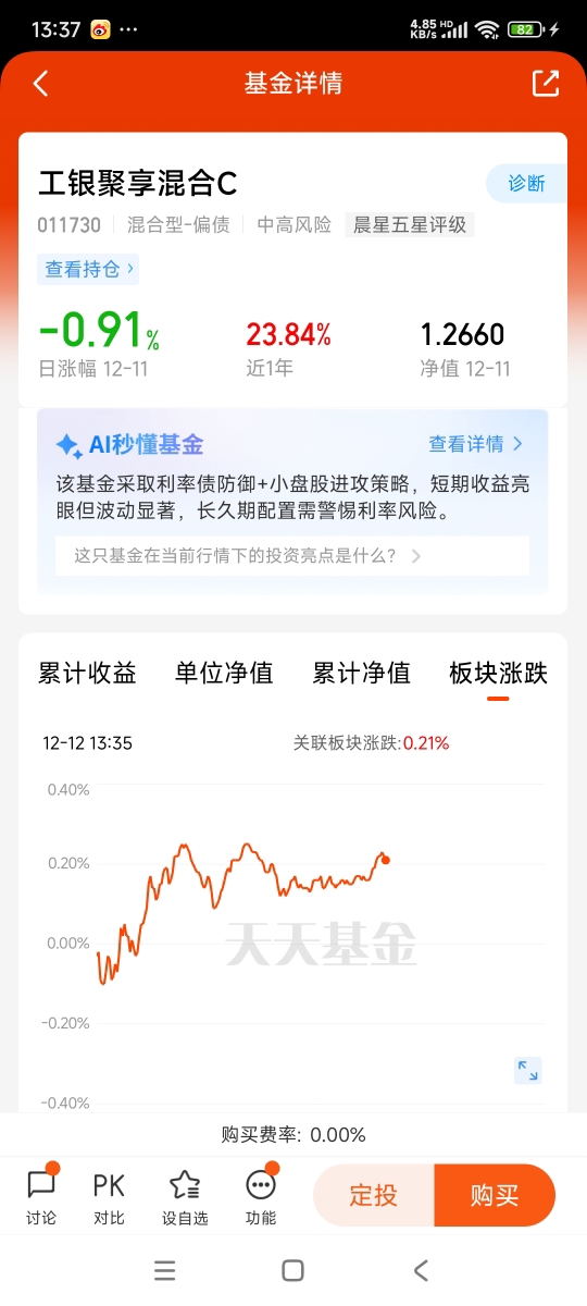 混合债近一年这表现超越好多股基呢!【工银聚享混合C 011730】年化收益率20个点,最近也跟随股票回落了一些,但是从近一年的历史收益曲线来看,每一次下跌 都是上车的好时机,主要是因为股市受政策影响拉升有力,适合求稳中还想追求增强收益的小伙伴。