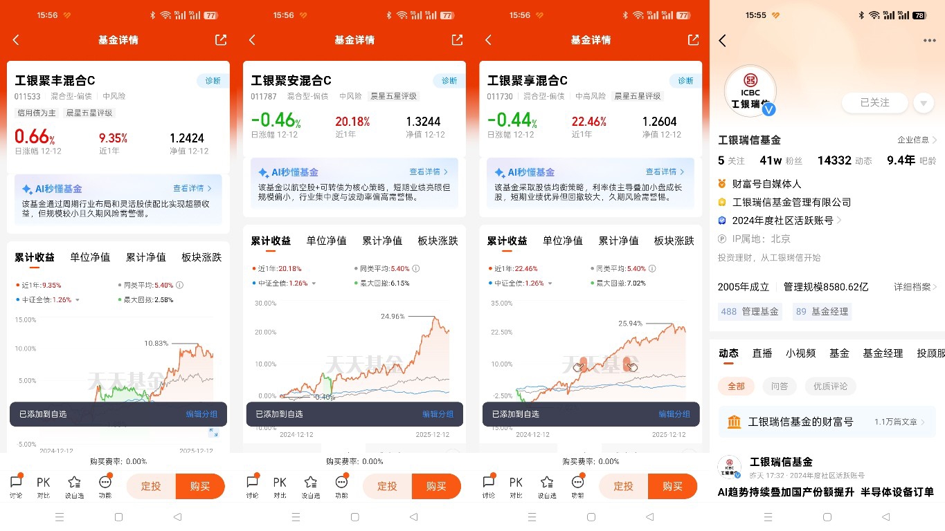 偏债混合基金通过动态调整股债比例,在债市方面聚焦短中端久期债券,规避长债利率风险,同时精选高等级信用债获取稳定利息收益;在股市方面,紧扣政策导向与经济复苏主线,布局优质赛道,避免盲目追高。$工银聚享混合C$ 近12个月22.46%的收益,正是这种精准适配的成果。随着跨年行情预热,股债市场有望迎来共振,偏债混合基金的配置价值将进一步凸显,持续成为市场热门选择。@工银瑞信基金