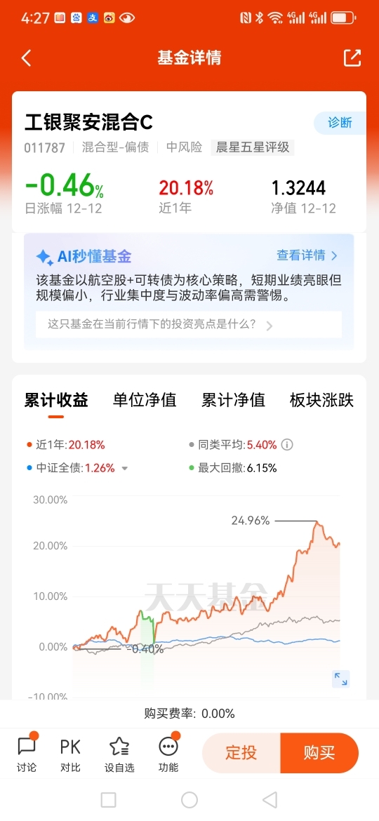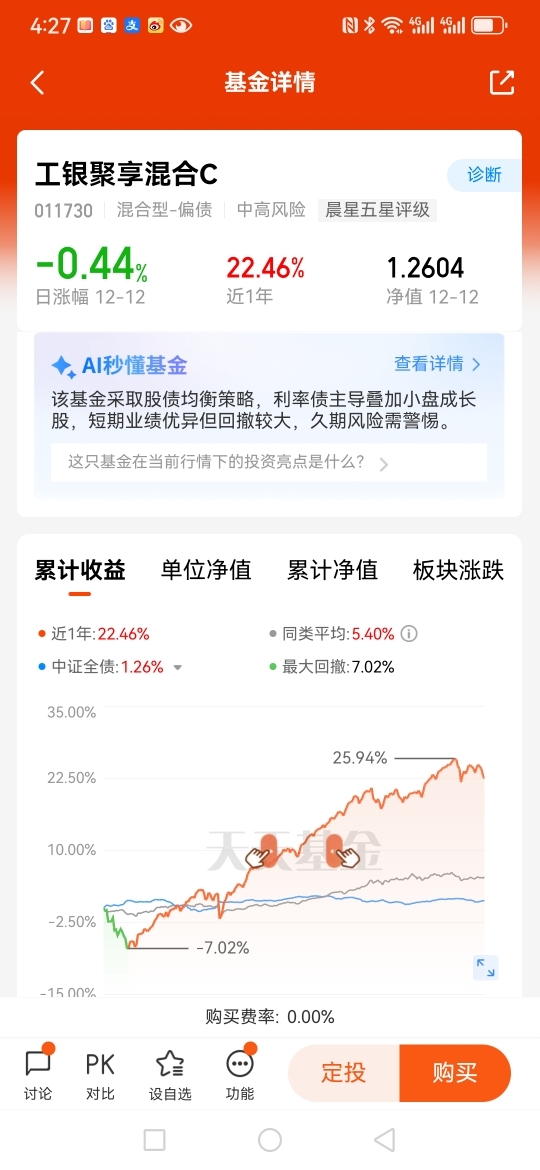 结语,$工银聚享混合C$ 就是偏债混合基金中的佼佼者,近一年收益30个点以上,妥妥的宝藏基金,弹性也不错,非常适合长期定投。