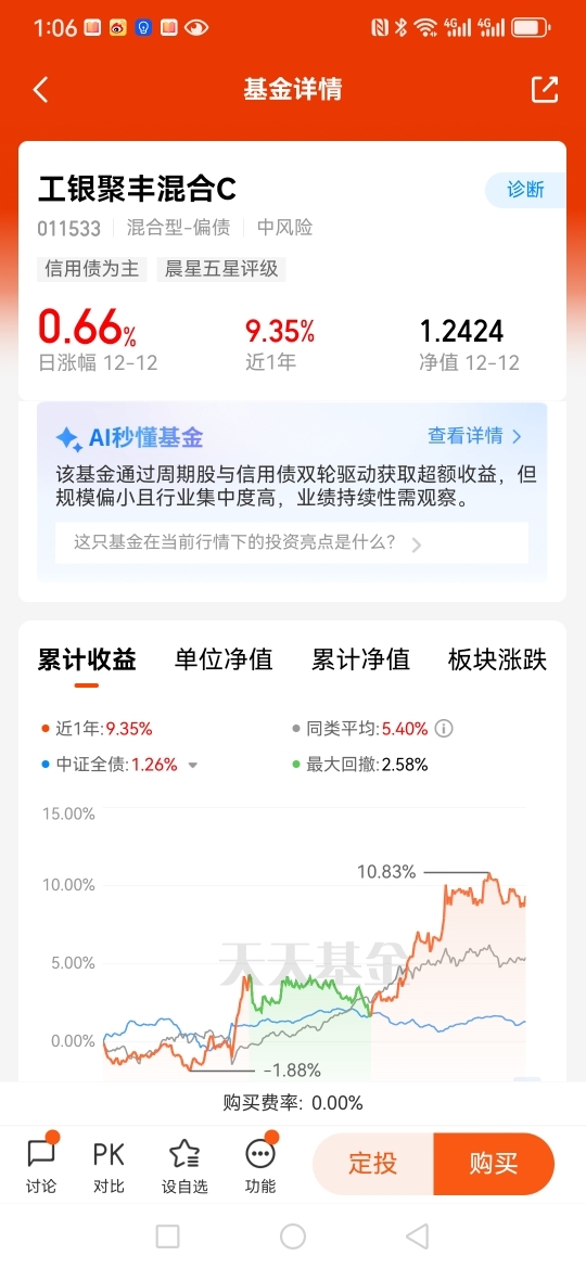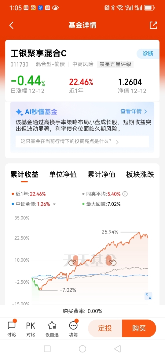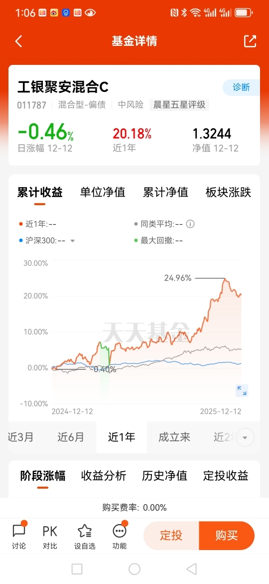 最近我一直在关注$工银聚享混合C$ 这只偏债混合基金,它的走势真的太让我惊喜了,回撤幅度很小,涨幅很大,近一年涨幅超过20个点。如果你也在为股牛债弱的市场环境发愁,不妨考虑下配置这只偏债混合基金。当然,选基金的时候一定要多做功课,看基金经理的过往业绩、持仓结构等等,才能立于不败之地。