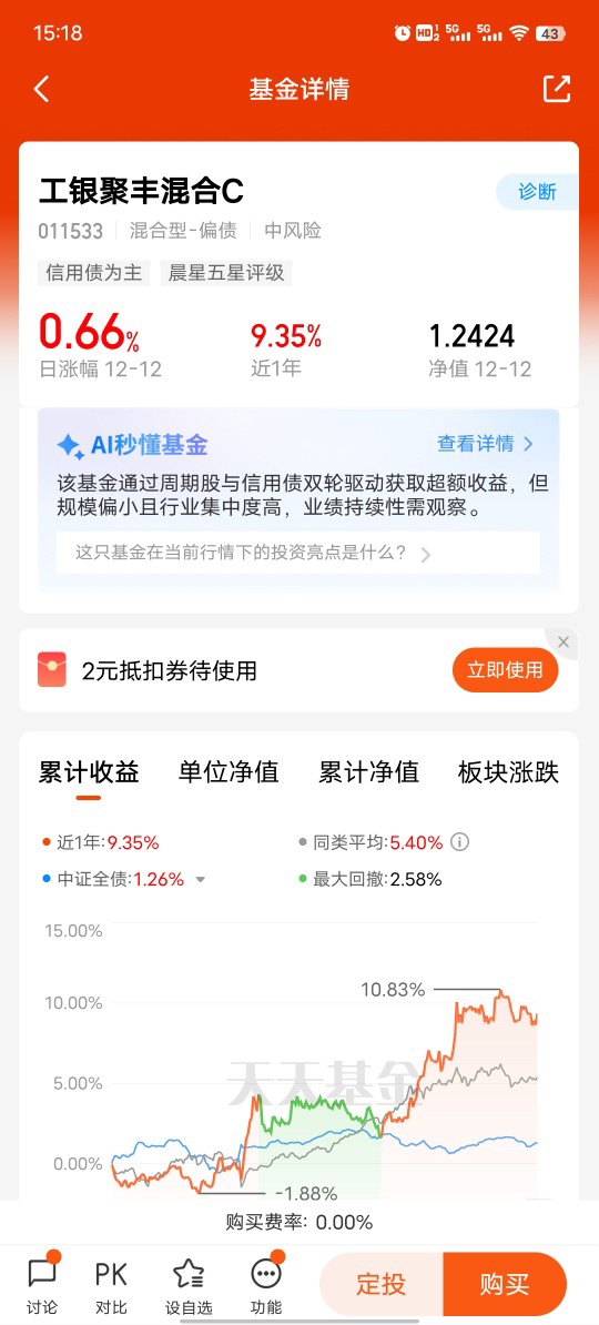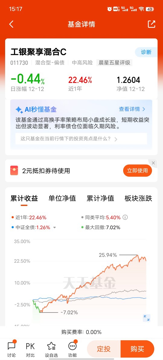 打卡第二天,$工银聚享混合C$ 本周下跌1.55%。上证指数最近一直处于4000点下方围绕3900点上下震荡,我认为这种情况选择固收+产品才是最正确的选择,$工银聚享混合C$ 是一支偏债型的混合基金。近一年上涨22.46%。该基金投资债券比例46.15%。股票比例39.82%。@工银瑞信基金