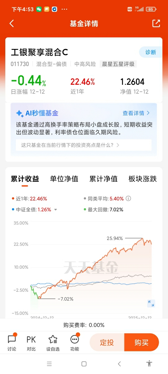 #工银聚焦偏债混#+工银聚享:量化+固收;工银聚享的特色是权益方面以“定量化筛选+分散配置”策略为主,周五回调0.44%, C类近1年净值增长22.46%,今年28.72%,排名居同类前1%,股票持仓约40%。该基进攻性强,收益超过了大部分权益基金!
